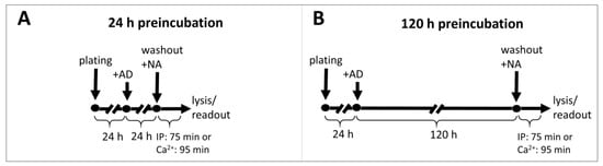 Timelines of experiments testing prolonged (24 h (A) and 120 h (B)) preincubation of cells expressing α1-AR subtypes with antidepressants. AD—antidepressant drug; NA—noradrenaline.