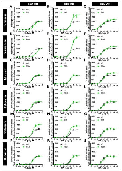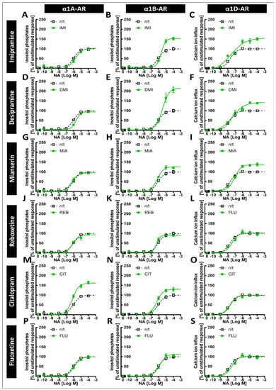 Dose–response curves for noradrenaline and the α1A-, α1B- and α1D-adrenergic receptor subtypes’ second messenger responses after a 24 h preincubation with the chosen antidepressant drugs. The graphs show the responses of cells after preincubation with the antidepressant imipramine (IMI, (A–C)), desipramine (DMI, (D–F)), mianserin (MIA, (G–I)), reboxetine (REB, (J–L)), citalopram (CIT, (M–O)) or fluoxetine (FLU, P–S) (green solid lines on the respective graphs), or the responses of control cells (black dotted lines on all graphs). The effects were tested by measuring the inositol phosphate production by cells expressing α1A-AR (A,D,G,J,M,P) or α1B-AR (B,E,H,K,N,R), or by measuring the noradrenaline-induced calcium ion influx of ChemiSCREEN™ Ready-to-Assay™ α1DA-AR-expressing cells (C,F,I,L,O,S). Each value represents the mean ± S.E.M. of at least four independent experiments conducted in duplicate.