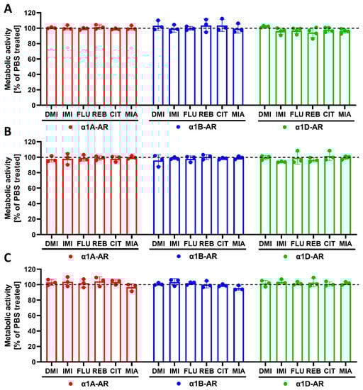Effects of incubation with the chosen antidepressants on the metabolic activity of cells expressing the α1A-, α1B- or α1D- adrenergic receptor subtypes. The cells were incubated with the chosen antidepressants for 30 min (A), 24 h (B) or 120 h (C). IMI—imipramine; DMI—desipramine; MIA—mianserin; REB—reboxetine; CIT—citalopram; FLU—fluoxetine or PBS (dashed line). Data are shown as the mean ± SD; n = 3–4 independent experiments.