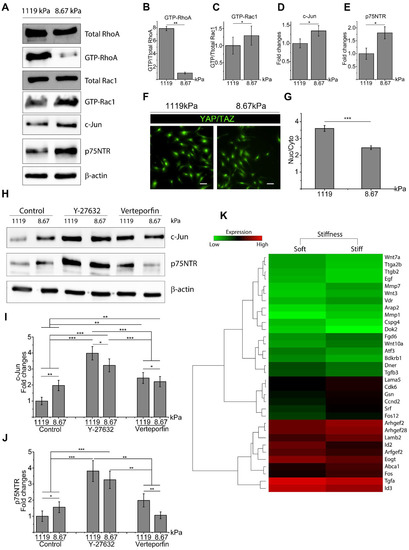 2.1. Matrix Stiffness Inhibits c-Jun and p75NTR with Activation of RhoA and YAP/TAZ