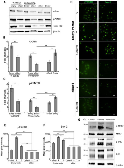 It has been demonstrated that RhoA inhibition resulted in the activation of Rac1 and promotion of SC regenerative markers. To elucidate the role of Rac1 in SC phenotype, SCs were transfected with Rac1 siRNA (siRac1). Rac1 inhibition was confirmed by Western blot following siRac1 transfection (Figure S2). c-Jun and p75NTR were also significantly downregulated following Rac1 inhibition, consistent with our previous results showing that Rac1 activation led to a higher SC regenerative capacity (Figure 2A). For the confirmation of Rac1 involvement in RhoA and YAP/TAZ inhibition, Y-27632 and Verteporfin-treated SCs were transfected with siRac1 or an empty vector. Figure 2A–C show that c-Jun and p75NTR expression levels were significantly downregulated following Rac1 inhibition when compared to SCs transfected with empty vectors. For Y-27632-treated SCs, expressions of both c-Jun and p75NTR were downregulated to a level similar to untreated SCs following siRac1 transfection (Figure 2A–C). The downregulation of SC markers caused by siRac1 transfection was higher for Verteporfin-treated SCs, where expression levels of both c-Jun and p75NTR were significantly lower when compared to untreated SCs (Figure 2A–C).