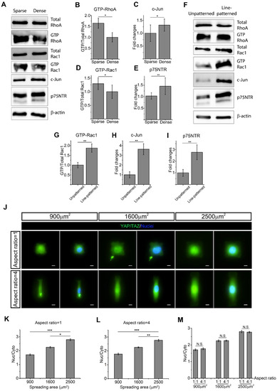 SC morphology, including total spreading area and elongation, has been linked with ECM stiffness. To explore the roles of morphology and ECM stiffness in SC phenotypes, we first controlled the average SC spreading area by initial culture density. As expected, it was shown that a higher seeding density significantly reduced the average spreading area (Figure S3A,B). Western blot analysis demonstrated there was no significant difference in total RhoA and total Rac1 expression for SCs with different average spreading areas (Figure 3A). However, active RhoA and Rac1 were significantly upregulated for SCs that possessed a larger average spreading area (Figure 3A,B,D). For SC markers, both c-Jun and p75NTR were downregulated in SCs with a larger spreading area (Figure 3A,C,E). Finally, immunofluorescence staining showed YAP/TAZ activity on micropatterned SCs of different spreading area and elongation, with cell morphology precisely controlled and cell–cell contact eliminated (Figure 3J). Nuclear YAP/TAZ quantification showed that YAP/TAZ translocated into the nuclear area as SC spreading area became larger, indicating an increased YAP/TAZ activity (Figure 3K,L). As reported in Section 2.3, active Rac1 upregulated certain SC markers, suggesting that cell spreading directs the SC phenotype via RhoA signaling, rather than Rac1 signaling.