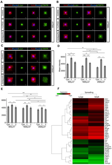 When cell spreading area remains constant, inhibition of RhoA and YAP/TAZ significantly upregulate the expression of c-Jun and p75NTR. Schwann cells (SCs) were seeded into (A) 900 μm2, (B) 1600 μm2, or (C) 2500 μm2 micropatterned cell adhesive islands. F-actin (red), nucleus (blue), c-Jun (green), and p75NTR (green) are visualized by immunofluorescence staining. Scale bar = 10 μm. (D,E) Statistical analysis shows the expression of c-Jun and p75NTR after Y-27632 and Verteporfin treatment. Mean pixel fluorescent intensities are measured for quantification. For fluorescent intensity quantification of micropatterned SCs, 5 unique trials with a minimum of 51 single micropatterned SCs per trial were quantified. (F) Microarray analysis indicates that SC with larger spreading area showed higher RhoA- and YAP/TAZ-associated genes and a decline in SC regenerative markers. Data are presented as the mean ± SEM. * p < 0.05, ** p < 0.005, *** p < 0.0005, p-values found in Supplemental Table S4.