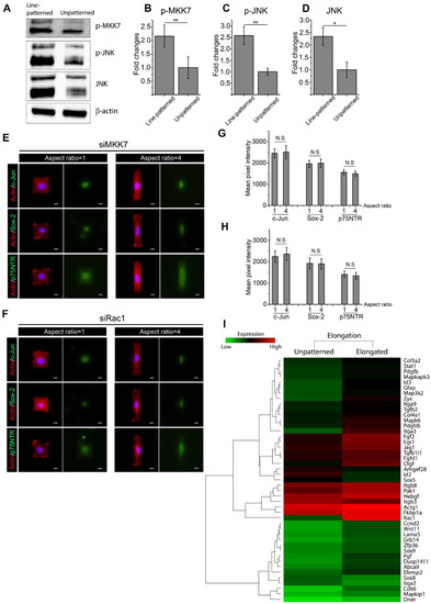 Rac1/MKK7/JNK signaling was inhibited by transfecting SCs with Rac1 siRNA (siRac1) and MKK7 siRNA (siMKK7). Inhibition was verified by Western blot, where siMKK7 and siRac1 transfection resulted in a significant downregulation of Rac1/MKK7/JNK activity (Figure S5). siMKK7- and siRac1-transfected SCs were then micropatterned into cell adhesive islands of equal area, but differing aspect ratios for the quantification of Sox-2, c-Jun, and p75NTR by fluorescent intensity (Figure 5E,F). SC elongation did not result in significant changes in the expression levels of any of c-Jun, Sox-2, or p75NTR, indicating a significant role for Rac1/MKK7/JNK signaling in SC morphology changes (Figure 5G,H). Furthermore, microarray analysis indicated that Rac1/JNK signaling was activated for elongated SCs, which was characterized by the upregulation of Zyx, Rac1, and Pak1 (Figure 5I) [57,58]. SC elongation also resulted in the upregulation of SC regenerative markers Egf-like domain, MAPK signaling, Id2, Wnt signaling, Fgf and Egr1 [46].