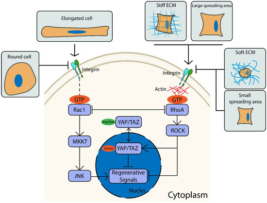 Here, we show that the complex interplay between the SC phenotype and the ECM is mediated, at least in part, by Rho GTPase and YAP/TAZ signaling (Figure 6). Specifically, ECM stiffness and cell spreading block key SC regenerative markers by upregulating active RhoA and YAP/TAZ. Furthermore, blocking RhoA and YAP/TAZ leads to increased expression of regenerative markers on a stiff ECM and larger spreading areas by the activation of Rac1/MKK7/JNK signaling. Rac1 signaling also plays a vital role in regulating the SC phenotype through cellular elongation, where SC elongation showed no change in the activities of both RhoA and YAP/TAZ. Inhibition of Rac1 significantly suppressed the expression of SC regenerative markers in elongated SCs to a level similar to non-elongated SCs, further confirming the role of Rac1 in SC shape.