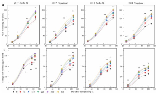 Sweet potato biomass accumulation of plant and storage root under different K2O rates in 2017 and 2018. (a) Plant biomass accumulation; (b) storage root biomass accumulation. Each data point is the mean ± SE of at least three replications. * and ** mean significance among the different K2O rates at the p < 0.05 and 0.01 probability levels, respectively.