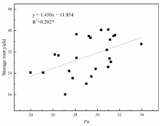 Relationship of the storage root yield (Mg ha−1) with Pn (μmol CO2 m−2 s−1) for six K2O rates in 2017 and 2018. n = 24; * is significant at p < 0.05.