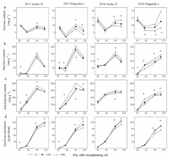 Changes of carbohydrate contents in SPSR under different K2O rates in 2017 and 2018. (a) Sucrose content; (b) amylose content; (c) amylopectin content; (d) starch accumulation. * is significant among the three K2O rates at p < 0.05.
