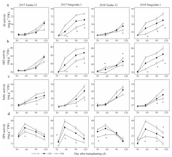 Effect of the K2O rates on sucrose-metabolizing enzyme activities in SPSR. (a) AI activity; (b) AKI activity; (c) SuSy activity; (d) SPS activity. * is significant among the three K2O rates at p < 0.05.