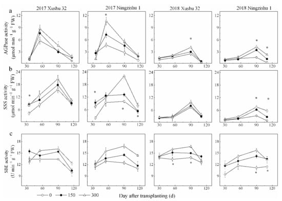Effect of K2O rates on starch-metabolizing enzyme activities in SPSR. (a) AGPase activity; (b) SSS activity; (c) SBE activity. * is significant among the three K2O rates at p < 0.05.