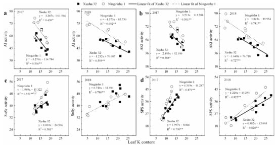 Relationships between the peak values of sucrose-metabolizing enzyme activities in SPSR and leaf K content in 2017 and 2018. (a) acid invertase (AI) activity; (b) alkaline invertase (AKI) activity; (c) SuSy activity; (d) SPS activity. The solid and dotted lines represent Xushu 32 and Ningzishu 1, respectively. * and ** are significant among the three K2O rates at p < 0.05 and p < 0.01, respectively.