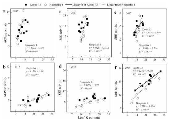 Relationships between the peak values of starch-metabolizing enzyme activities in SPSR and leaf K content in 2017 and 2018. (a) AGPase activity in 2017; (b) AGPase activity in 2018; (c) SSS in 2017; (d) SSS in 2018; (e) SBE in 2017; (f) SBE in 2018. The solid and dotted lines represent Xushu 32 and Ningzishu 1, respectively. * and ** are significant among the three K2O rates at p < 0.05 and p < 0.01, respectively.