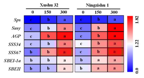 Starch is the major form of fixed carbon in SPSR, about 50–80% of SPSR’s dry biomass [4,5]. Rational fertilization is of great importance to obtain a high starch yield. In this study, K application enhanced starch accumulation in SPSR compared to the no-K treatment (Figure 3d). However, the content of starch in SPSR, as the sum of amylose and amylopectin (Figure 3b,c), was decreased by K application, probably because of the dilution effect of protein [36]. Starch synthesis in plastids is closely related to the hydrolysis of sucrose in cytoplasm [17], which involves many enzymes and their coding genes that convert sucrose to starch during SPSR development.