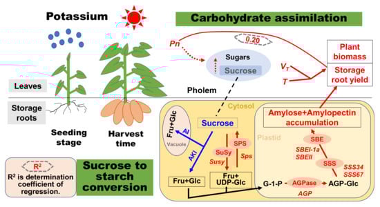 In this study, the storage root number appeared to be similar between cultivars, while the fresh weight per storage root, as well as storage root yield, were significantly affected by years, cultivars and K2O rates (Table 4). Compared to the no-K treated sweet potato, K led to an increased yield. Averaged across DAT for each K2O treatment over two years, compared to the no-K treatment, the storage root yield after the 75–300 kg K2O ha−1 treatments were increased by 13–29% for Xushu 32 and 17–48% for Ningzishu 1, respectively, whereas the storage root yield after the 375 kg K2O ha−1 treatment was only increased by 26% for Xushu 32 and 45% for Ningzishu 1, respectively. When all data from K2O rates were pooled, the storage root yield had a significant positive relationship with Pn (Figure 2). In the following study, three K2O rates (0, 150 and 300 kg K2O ha−1) were selected to analyze the changes of the conversion of sucrose-to-starch in the SPSR.