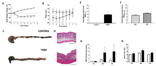 Male Wistar Han rats of 8 to 12 weeks of age (littermates) were randomly assigned to the control or TNBS group. Control animals were not subjected to any manipulation. On day −1, rats of the TNBS group were individually housed in clean cages and fasted overnight with ad libitum access to a 5% sucrose solution. Then, on day 0, they were anesthetized ad effectum with isoflurane (Isoflo®, Esteve, Barcelona, Spain) and a 21% ethanolic solution of TNBS (Sigma-Aldrich Inc, St. Louis, MO, USA) (20 mg/rat; 250 µL) was rectally instilled (adapted from Morris et al. [66], using a 7.6 cm ball-tipped catheter (ST1 75-0285, Harvard Apparatus)). Rats were maintained in a head-down position for 60 s to ensure TNBS distribution and no leakage. Analgesia was provided, with daily administration of paracetamol (Paracetamol®, Farmoz, PO, 500 mg/kg) in a honey-based solution from day 0 until day 7. Tramadol (Labesfal, 100 mg/2 mL, SC) was only administered when animals presented severe signs of discomfort. In addition, metoclopramide (Labesfal, 1 mg/kg, SC) was administered from day −1 (before induction) to day 2 of the protocol to assure intestinal motility. All animals were monitored daily throughout the protocol to ensure their well-being and to record individual body weight and the number of fecal pellets. No mortality was observed in this study.