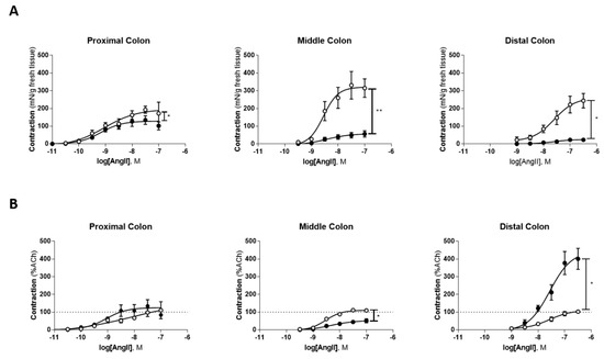 Concentration-response curves to Ang II. (A) Ang II-mediated response expressed as tension (mN/g of fresh tissue) in the proximal colon (controls, open circles, n = 7 vs. TNBS-induced rats, black circles, n = 10), middle colon (controls, open circles, n = 5 vs. TNBS-induced rats, black circles, n = 10) and distal colon (controls, open circles, n = 6 vs. TNBS-induced rats, black circles, n = 6); (B) Ang II-mediated response expressed as a percentage of ACh (%ACh) in the proximal colon (controls, open circles, n = 7 vs. TNBS-induced rats, black circles, n = 9), middle colon (controls, open circles, n = 5 vs. TNBS-induced rats, black circles, n = 10) and distal colon (controls, open circles, n = 6 vs. TNBS-induced rats, black circles, n = 6). Vertical lines point to statistically significant differences in the Emax of the corresponding groups, * p < 0.05, ** p < 0.0001.