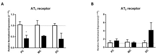 Relative normalized expression (2−∆∆Ct) of (A) AT1 (PC: n = 3, MC: n = 2; DC: n = 3) and (B) AT2 (PC: n = 2; MC: n = 3; DC: n = 2) receptors in the controls (white bars) and TNBS-induced (black bars) animals. * p < 0.05 vs. corresponding control group.