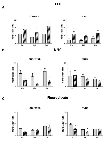 Contractile response to Ang II in the PC, MC and DC in the absence (gray bars) and presence (striped bars) of (A) TTX 1 µM in control (PC: n = 6; MC: n = 5; DC: n = 5) and TNBS-induced animals (PC: n = 6; MC: n = 4; DC: n = 6); (B) NNC 55-0396 10 µM (PC) or 30 µM (MC and DC) in control (PC: n = 8; MC: n = 8; DC: n = 6) and TNBS-induced animals (PC: n = 6; MC: n = 5; DC: n = 6); and (C) fluorocitrate 300 µM in control (PC: n = 7; MC: n = 5; DC: n = 5) and TNBS-induced animals (PC: n = 5; MC: n = 6; DC: n = 7). * p < 0.05 vs. Ang II alone.