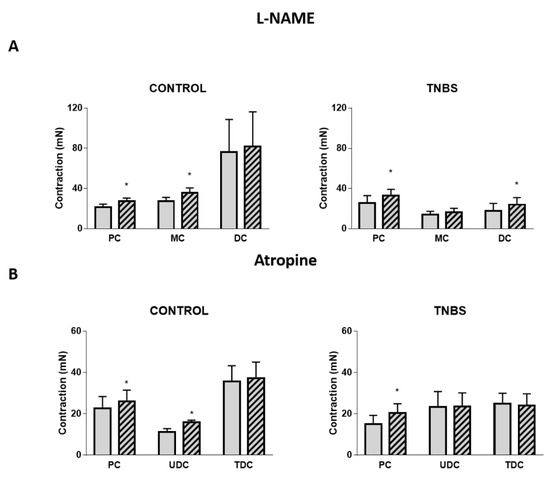 Contractile response to Ang II in the PC, MC and DC in the absence (gray bars) and presence (striped bars) of (A) L-NAME 100 µM in control (PC: n = 5; MC: n = 6; DC: n = 6) and TNBS-induced animals (PC: n = 6; MC: n = 5; DC: n = 6); and (B) atropine 1 µM in control (PC: n = 5; MC: n = 6; DC: n = 6) and TNBS-induced animals (PC: n = 6; MC: n = 5; DC: n = 5). * p < 0.05 vs. Ang II alone.