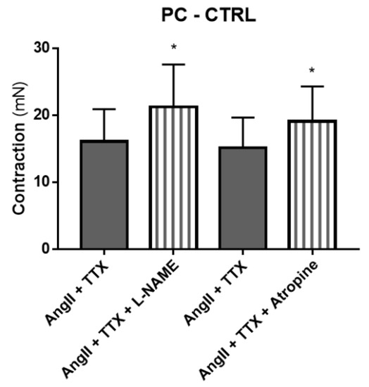 Contractile response to Ang II in the PC of control animals in the presence of TTX 1 µM (dark gray bars) compared to the presence of TTX and L-NAME 100 µM (n = 6) or atropine 1 µM (n = 5) (striped bars). * p < 0.05 vs. Ang II with TTX.