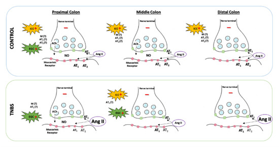 In conclusion, our study showed that in rats with mild/moderate experimental colitis caused by TNBS, Ang II-induced contraction was decreased. This possibly resulted from downregulation of AT1 receptors and alterations in the communication between the intricate network of neuronal and non-neuronal cells (as ICC and EGC) by NO and muscarinic receptors.