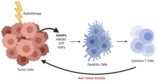 Radiation therapy has been a mainstay treatment for many forms of cancer since the late 1800s. Historically, radiation has been thought to work solely through direct contact-based killing, but there has long been the postulation of immune involvement through the hypothesis of the abscopal effect [11]. The abscopal effect occurs when an irradiated tumor initiates a cascade of events with the release of damage-associated molecular patterns (DAMPs) such as high mobility group box 1 (HMGB1), adenosine triphosphate (ATP), and heat shock proteins (HSPs). These DAMPs act on receptors that are expressed on dendritic cells (DCs), leading to antigen presentation, tumor-specific killing from cytotoxic T cells, and ultimately anti-tumor activity (Figure 1). The abscopal effect was first clinically documented in 1953 [12], but interest waned with rare occurrences noted and difficulties in recapitulating the phenomenon in preclinical models. Now, in the era of immunotherapy, there is a much deeper understanding of the immune system and the interplay of cells in the tumor microenvironment (TME), and the abscopal effect has once again been brought to the forefront of oncologic research.