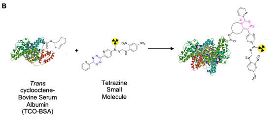 Schematic representation showing the inverse electron-demand Diels–Alder reaction between the trans-cyclooctene and tetrazine-based moieties. (A) Simplified schematic of the overall conjugation and labeling strategy. *Created using BioRender.com. (B) Schematic showing the key functional groups used to label albumin.