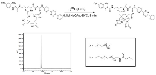 Radiolabeling scheme and radio-HPLC chromatogram of the tetrazine small molecule labeled with lutetium-177.