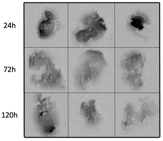 Autoradiography of tumors treated with a single intratumoral injection of RT shows distribution in the TME. C57/Bl6 mice bearing subcutaneous E0771 tumors were treated with a single intratumoral dose of RT (0.15–0.30 MBq). Mice were sacrificed at 24, 72, and 120 h after treatment, and tumors were harvested and flash frozen for autoradiography. Each image represents a slice of an individual tumor. The darker the area, the more radioactive decay that was detected in that area.