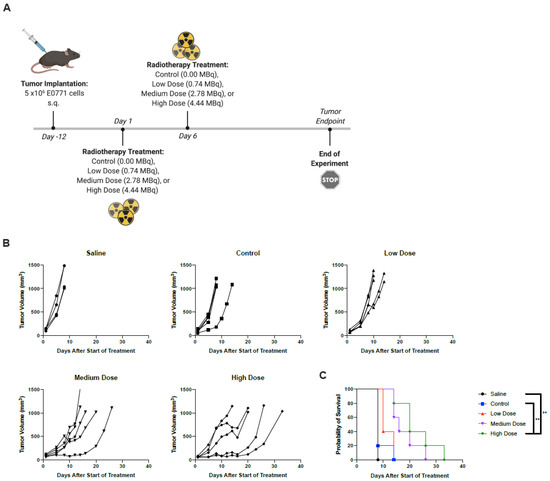 Two administrations of the highest dose RT improved survival outcomes. (A) C57/Bl6 mice bearing subcutaneous E0771 tumors on the left flank were treated with PBS, control (non-radioactive compound), low dose (0.74 MBq), medium dose (2.78 MBq), or high dose (4.44 MBq) on days 1 and 6. *Created using BioRender.com. (B) Tumor volumes were measured every 2–3 days from the start of treatment until mice reached endpoint. Each line represents an individual mouse within the group. (C) Kaplan–Meier survival curves of each group. ** p < 0.01.