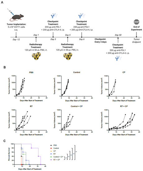 RT + CP significantly improves overall survival. (A) C57/Bl6 mice bearing E0771 tumors were treated with PBS, control, CP (anti-CTLA4 and anti-PD-L1), RT, control + CP or RT + CP. *Created using BioRender.com. (B) Tumor volumes were measured every 2–3 days from the start of treatment until mice reached endpoint. Each line represents an individual mouse within the group. (C) Kaplan–Meier survival curves of each group. ** p < 0.001.