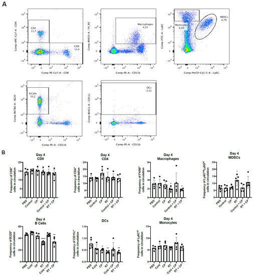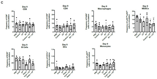 To investigate the systemic effects of therapeutic intervention, we performed immune analysis studies. E0771 tumors were grown in C57/Bl6 mice and treated with PBS, control, CP, RT, control + CP, and RT + CP. RT doses were kept consistent with previous studies in Figure 6 and Figure 7. Blood was drawn on days 4 and 9, and peripheral blood mononuclear cells (PBMCs) were analyzed via flow cytometry (Figure 8). While no significant difference was seen in CD4+ or CD8+ T cells, RT and RT + CP significantly reduced macrophages (F4/80+ cells), B cells (B220+ cells), and dendritic cells (DCs, CD11c+ cells) on day 4. Interestingly, while no therapy was able to suppress myeloid-derived suppressor cells (MDSCs; Ly6GhiLy6Cint cells) at day 4, both control + CP and RT + CP significantly decreased the frequency of circulating MDSCs on day 9. Again, we see that B cells were suppressed by RT and RT + CP at day 9, which we believe can be attributed to their high level of radiosensitivity [30].