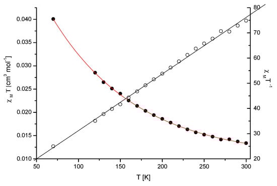 The magnetic susceptibility of the Mn(II) complex (Mn-dipyCO-NO3) was measured over the range of 70–300 K (Figure 1). The measured values obey the Curie–Weiss law, suggesting paramagnetic properties. The magnetic moment values, experimentally determined at 70–300 K for the compound, changed from 4.94 to 5.69 MB. The value of the room temperature magnetic moment of Mn-dipyCO-NO3 is equal to 5.67 MB, and it is indicative of high-spin Mn(II) ion. This value is very close to the spin- only value for the Mn2+ ion calculated from the equation µeff = [4S(S + 1)]1/2 in the absence of the magnetic field. The high-spin Mn(II) ion possesses a half-filled 3D shell and thus the coordination geometry of its complex is not subject to ligand field effects and are determined mainly by the chelating power and geometrical arrangement of the ligand.
