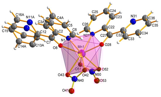 The Mn(II) complex crystallizes in a triclinic space group P. The molecular structure of the complex Mn-dipyCO-NO3 is shown in Figure 2. The selected bond lengths and angles are listed in Table S2. The manganese environment is eight-coordinated with the two nitrate ions and two dipyCO molecules. The complexes with CN = 8 are very rare. Both bidentate nitrate and organic ligands are arranged in cis position. The manganese environment adopts distorted pseudo-dodecahedral geometry resulting from the positions of the organic and inorganic ligands, as they are not symmetrical or equivalent. In general, the deviation from the ideal dodecahedral geometry is shown by the bond distances resulting from the size of the chelating rings.