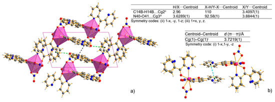 Packing view of the coordination polyhedral system forming a rhombic 3D network and the geometry of C–H⋯π (black line) and N–O⋯π (green line) interactions (X-H⋯π and Y-X⋯π interactions, view along [010] direction)—(a), and π⋯π stacking interaction—(b) for Mn-dipyCO-NO3. Cg(1) denotes the gravity ring center of N(31)-C(32)-C(33)-C(34)-C(35)-C(36); Cg(2) denotes the gravity ring center of C(12)-N(11B)-C(16B)-C(15)-C(14B)-C(13B); Cg(3) denotes the gravity ring center of N(21)-C(22)-C(23)-C(24)-C(25)-C(26).