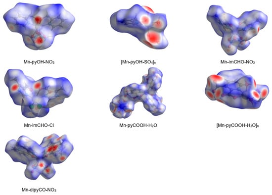 In the last decade, the analysis of molecular crystal structures using Hirshfeld surfaces has rapidly gained in popularity. HS analysis provides a convenient means of studying different types of intermolecular interactions in crystals, because this tool enables these interactions to be interpreted by visualization []. This applies especially to the identification of close contacts deemed to be important—and to view molecules as “a whole”. The molecular Hirshfeld surface of the Mn(II) complexes were presented in Figure 4. Three-dimensional (3D) Hirshfeld surface maps were obtained using red–white–blue dnorm surface maps (surface resolution −0.5 to 1.6 Å), where red indicates shorter contacts with negative dnorm values, white indicates close van der Waals contacts with zero dnorm values, and blue indicates longer contacts with positive dnorm values. A shape index provided a measure of the “shapes” of molecules in lattices, enabled complementarity between molecules to be identified, and provided π–π interaction information. Some significant π–π interactions were observed for all of complexes, (red and blue triangles represented π–π stacking).