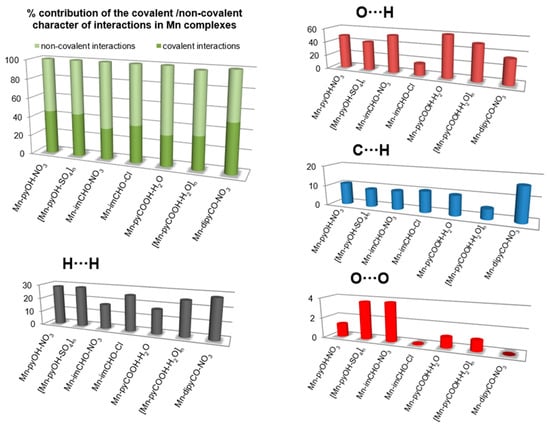 The plots for the most significant intermolecular interaction within the series of the Mn(II) complexes showing percentages of contacts contributing to the total HS area.