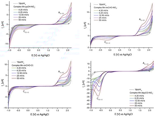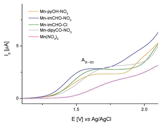 Concluding, the anodic peak potentials related to the oxidation of the Mn(II)/Mn(III) increase in the following order for the manganese complexes: Mn-imCHO-NO3 < Mn-pyOH-NO3 < Mn-imCHO-Cl < Mn-dipyCO-NO3 (Figure 7; at scan rate 6.25 mVs−1). Thus, the presented row indicates a decrease in the reducing properties for the tested Mn(II) complexes. Thereby, the oxidation efficiency of the Mn(II) complexes results from the row mentioned above.
