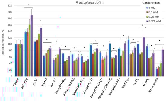 P. aeruginosa PAO1 biofilm formation in the presence of the Mn(II) complexes, free ligands, and Mn(II) salts (concentrations of compounds—1–0.125 mM). The absorbance of the control was considered to represent 100% of biofilm formation (results were considered significant when compared to control; * p < 0.05. Data are presented as mean ± SD, n = 4).