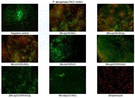 The effect of the manganese complexes (the concentration of 0.5 mM) on the cell viability of P. aeruginosa in the biofilm layers using the LIVE/DEAD fluorescence assay was also assessed. The mixture of two fluorescent dyes, the dye SYTO-9, and the propidium iodide (included in the FilmTracer™ LIVE/DEAD Biofilm Viability Kit) was used to distinguish live and dead cells. The SYTO-9 can penetrate most membranes freely and is used for assessing total cell counts. In contrast, propidium iodide penetrates cells with compromised membranes, differentiating the damaged bacterial cells from a metabolic active, live cells. As a result, microorganisms with intact cell membranes stain fluorescent green, whereas microorganisms with damaged membranes stain fluorescent red. Analysis of representative images from an epifluorescence microscope (Figure 9) demonstrates that the Mn(II) complexes lead to morphological changes in the structure of the P. aeruginosa PAO1 biofilm. The presence of compounds in the culture caused the aggregation of cells into microcolonies, which was not observed in the control. This observation proves that bacteria were trying to protect themselves against the effect of the complexes tested. In addition, the tests revealed damage to the bacterial cell walls following treatment with the manganese complexes, in particular with compounds Mn-pyOH-NO3, [Mn-pyOH-SO4]n and Mn-imCHO-NO3. These results are in accordance with the data obtained by crystal violet staining.