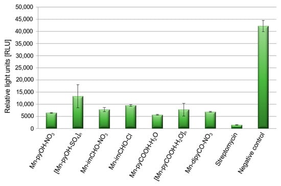 Pyoverdine determination was performer in TSB medium. Measurement of pyoverdine fluorescence was performed at the excitation wavelength λ = 398 nm and the emission wavelength λ = 455 nm as described previously []. Experiments were carried out in triplicate in 96-well black flat-bottomed microtiter plates (Greiner, Monroe, NC, USA) for 24 h in cell-free culture medium using an Infinite M200PRO (Tecan, Männedorf, Switzerland). The assay was performed with the series of Mn(II) complexes (0.5 mM) and streptomycin as a positive control, and TSB medium with inoculated bacteria as a negative control. The siderophore secretion assay was conducted as three independent repeats. The results obtained were not disturbed by the emission band characteristic of the Mn(II) complexes.