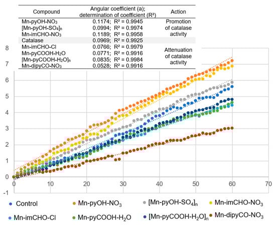 First, the complexes were incubated with the catalase in the presence of a phosphate buffer, and then hydrogen peroxide was added thereto. To study the effect of the manganese complexes on the activity of CAT, its performance, in the presence of similar concentrations of the Mn complexes (0.5 mM), was investigated. The percentage of absorbance reduction over time was recorded at 240 nm. The positive control was the catalase sample in the absence of the Mn(II) complex. Figure 12 illustrates the effect of the Mn(II) complexes on the catalase activity. As Figure 12 shows, the addition of the Mn(II) complexes to the CAT solution reduced the CAT activity gradually. The highest angle of inclination of the straight line was observed for the positive control and for the complexes: Mn-pyOH-NO3, [Mn-pyOH-SO4]n, and Mn-imCHO-NO3.