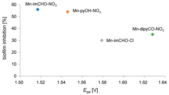 Noteworthy examples are where electrochemistry, dealing with different aspects of electron transfer (ET), contributes significantly to biomedical chemistry []. Many of the most important physiological processes are based on redox chains, including numerous enzyme-catalyzed processes (respiratory tract). Thus, there is a set of similarities between electrochemical and biological reactions concerning electron transfer (ET) pathways []. In our research, we attempted to find out the relationship between the percentage value of biofilm mass inhibition and the value of the Mn(II)/Mn(III) system potential for the studied Mn complexes (Mn-pyOH-NO3, Mn-imCHO-NO3, Mn-imCHO-Cl, Mn-dipyCO-NO3). The results of our study indicate that the higher the half-wave potential, the higher the inhibition of the manganese complexes (Figure 13). Only in the case of the Mn-dipyCO-NO3 was the regularity not exactly maintained because, in the studied potential ranges, the ligand also participated in the redox reaction. The existence of such regularity can suggest the metal center can interact with biological targets based on redox reactions. Taking into account the plasticity of the redox properties of the manganese ion, it can be assumed that Mn(II) complexes may cause oxidative stress in bacterial cells.