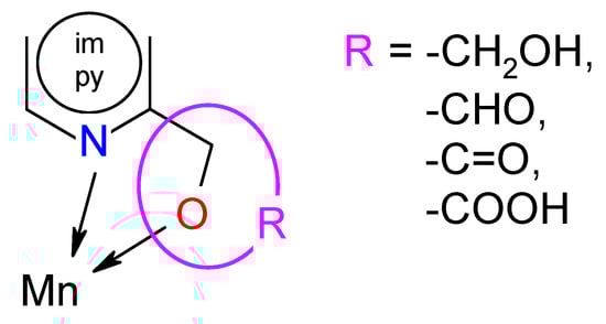The analysis of SAR enabled the determination of the chemical groups responsible for evoking a biological effect in the organism. This allowed for modification of the effect or improvement of the potency of a bioactive compound by changing its chemical structure []. Our group used the techniques of chemical synthesis to introduce various chemical groups into the compound and tested the modifications for their anti-biofilm effects. A series of the Mn(II) complexes with ligands consisted of the privileged structures such as imidazole (im) or pyridine (py) rings substituted different functional groups (-OH, -CHO, -C=O, -COOH) were examined (Scheme 1). A large number of heteroaromatic compounds containing pyridine or imidazole core are associated with diverse pharmacological properties such as antimicrobial, anticonvulsant, antiviral, antifungal, etc. [,,,,].