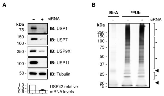 We silenced independently five DUBs from the USP family: USP1, USP7, USP9X, USP11 and UPS42, as confirmed by Western blotting or in the case of USP42, due to lack of suitable antibodies, by quantitative RT-PCR (Figure 1A). Silencing of these five DUBs had no effect in the global levels of conjugated ubiquitin (Figure S2), and the amount of ubiquitinated proteins isolated from the cell extracts by biotin pull-downs was equivalent in both the bioUb control and DUB-silenced samples (Figure 1B and Figure S3).