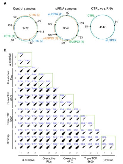 Reproducibility of the mass spectrometry analyses. (A) Overlap between proteins identified in control and siUSP9X samples. Venn diagrams showing the overlap of the proteins identified among the three replicas of each condition, as well as between both conditions are shown. (B) Multicorrelation graphs of label free quantification (LFQ) intensities (in log2 scale) of proteins identified across the control replicas of all the experiments. Pearson’s correlation coefficient is shown in blue. Correlations of the three replicas of the same experiment are highlighted with a green square.