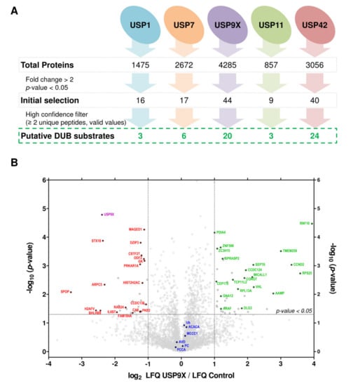 Identification of putative deubiquitinatint enzyme (DUB) substrates. (A) Summary of the putative substrates identified for each DUB. Proteins with a significant 2-fold increase of their abundance upon DUB-silencing were considered to be more ubiquitinated (initial selection). Of those, only proteins with at least two unique peptides and with low levels of imputation during the statistical analysis were considered as putative DUB substrates. (B) Putative substrates of the USP9X DUB. Volcano plot shows differentially ubiquitinated proteins upon USP9X silencing, relative to control samples. Abundance of each individual protein was determined by their label free quantification (LFQ) intensities. The LFQ siRNA/control ratios (log2 scale) and the t-test p-values (−log10 scale) are displayed in the X and Y axis, respectively. The threshold for statistical significance (p-value < 0.05) is indicated with a horizontal grey line, while vertical grey lines depict a 2-fold increase or decrease of the ubiquitinated levels upon DUB silencing. Proteins with a 2-fold increase or reduction of their ubiquitination levels upon USP9X silencing are shown in green and red respectively. USP9X is shown in purple. Endogenously ubiquitinated proteins (ACACA, MCCC1, PC and PCCA), ubiquitin (Ub) and avidin (AVD) are coloured in blue.