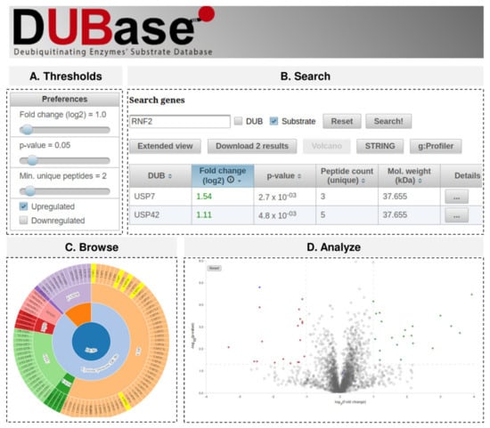 Deubiquitinating enzymes’ (DUBs) substrates database (DUBase). Example of the different tabs available in the web site are depicted. (A) Default threshold values can be customized to meet the user preferences, and these settings will be considered by the rest of the tabs during the user session. (B) The search tab allows querying by a given DUB name or by its substrate name and displays a table with the results. Then, the user can navigate the information in the database by clicking the different results, download them in CSV file format, display an interactive volcano plot (which also shows the identifications below the thresholds), and also can communicate the results to other web tools such as STRING or g:Profiler to identify affected pathways. (C) A simple alternative to reach these results for a given DUB is to use the browse tab, which displays in an interactive hierarchical chart the different DUB classes and highlights those for which there is information in the database. (D) In the analyse section gene ontology searches or volcano plots can be performed.
