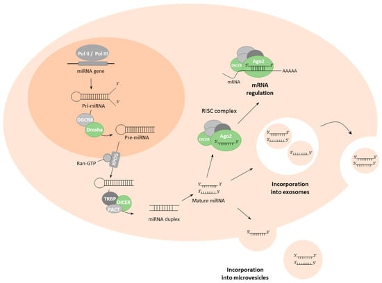 MiRNA biogenesis starts with the transcription of pri-miRNA sequences from the DNA, with approximately half of miRNAs encoded within intragenic sequences, mainly from introns with the remainder transcribed from intergenic regions and regulated by specific promoter regions []. Approximately half of pri-miRNAs encode for multiple miRNAs in a cluster. MiRNA biogenesis can follow either canonical or non-canonical pathways []. The canonical miRNA biosynthetic pathway starts with transcription of the pri-miRNA sequence by RNA polymerase II/III; then, RNase-III endonucleases Drosha in concert with the DGCR8 (DiGeorge syndrome critical region 8) cofactor cleave pri-miRNA to form a hairpin pre-miRNA structure []. DGCR8 acts to recognize motifs within the pri-miRNA, such as N6-methyladenylated GGAC, while Drosha cleaves pri-miRNA at the base of the structure [,]. The resultant pri-miRNA hairpin structure is exported to the cytoplasm by the exportin-5 (XPO5)/RanGTP complex [], where it is processed by the RNAse III endonuclease Dicer, which removes the terminal loop of the pre-miRNA structure, resulting in a mature miRNA duplex (Figure 1) []. The duplex separates into single-strand effector miRNAs which are loaded into the Argonaute (AGO) protein to form the RNA-induced silencing complex (RISC) that regulates expression of target genes through binding of the miRNA to (primarily) the 3′UTR region of mRNA [,], although instances exist whereby miRNAs can bind to the 5’UTR region, promoter regions and even the coding sequence [,,]. Gene regulation by miRNAs primarily occurs at the post-transcriptional stage and many mechanisms have been described, the majority of which act negatively although positive regulation has also been described [].