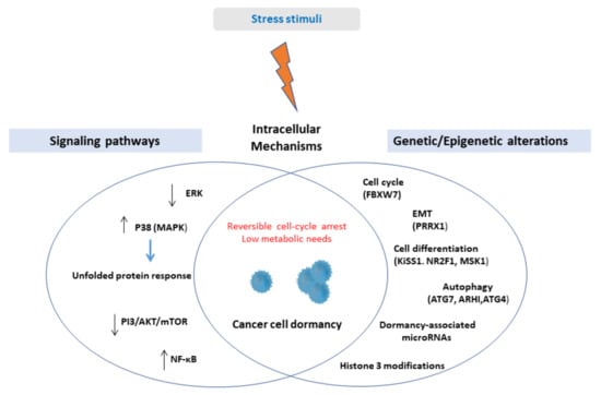 A schematic illustration of intracellular mechanisms inducing cellular dormancy is presented in Figure 1.